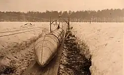 In 1931 it was decided to test the project in a larger scale, building an initial 3 kilometre wooden model of the U-shaped rail.[8] At this time the first doubts began to be voiced in the press and among specialists, both on account of the technical complexity of the project and of its cost, but the Sharopoyezd managed to secure the continued backing of the authorities. Between late 1931 and early 1932 the tracks were finished, and by April 1932 the first test carriage was also completed. It was a cylindrical structure with a frontal hood, of around 6 metres in length and 80 centimetres in width, with two wheels of around 1 meter in diameter, one at the front and another one at the back, each suited with an internal three-phase electric motor. By fall 1932 an additional four carriages had been built, which allowed for the testing of the entire unit. In testing the Sharopoyezd reached a speed of 70 km/h, and after successful early trials with empty carriages it was subsequently tested carrying both cargo and passengers.[9]