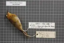 Sharpe's akalat was described by the English ornithologist George Ernest Shelley in 1903. He coined the binomial name Callene sharpei.[2] Sharpe's akalat is now placed in the genus Sheppardia that was introduced by the South African ornithologist Alwin Karl Haagner in 1909.[3] Both the common name and the specific epithet honour the English ornithologist and museum curator Richard Bowdler Sharpe.[2]
