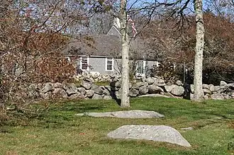 The Sheffield House is an historic house on Beach Road in the Quonochontaug section of Charlestown, Washington County, Rhode Island. It is a 1+1⁄2-story, wood-shingled, gambrel-roofed residence, with a large, stone chimney; a simple entry at the left side of a 3-bay, south-facing façade; and a 1-story wing at the left side. The house was probably built between 1685 and 1713, probably by Joseph Stanton (1646-1713), the third son of Thomas Stanton (1616-1677), one of the original settlers in this area.[2] Joseph's son Thomas (1691 aft. 1720), had no surviving sons, so the farm was deeded in 1753 to his son-in-law Nathaniel Sheffield (1712-1790) the husband of Rebecca Stanton (1713-1775). Today the house is called the Stanton-Sheffield house.