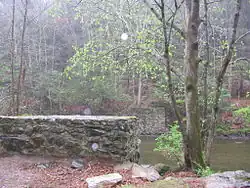 The river flows past the remains of a pedestrian bridge used by visitors to Holiday House from the Shepaug Railroad in the 1900s. Photo taken April 22, 2012.