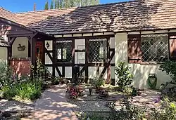 Although Tudor revival homes incurred greater expense to manufacture, they were popular and built in all sizes, including sprawling mansions and small cottages.[3] Most Tudor Revival homes, however, were large manors built in upscale neighborhoods. While the majority of Tudor Revival homes are located in the Northern United States since their facade is ideal for colder climates, the style did become popular in certain parts of Southern California, including such neighborhoods as Hancock Park and Windsor Square in the Wilshire District of Los Angeles. By the 1920s, Los Angeles became a mecca for aspiring craftspeople and artists, lured there by the motion pictures industry.[4] Flush with new wealth, movie moguls and stars sought luxurious living quarters befitting their new status, engendering an abundance of unique architectural revival styles in Los Angeles. Expansive, idealized versions of everything from Mediterranean villas to Spanish Missions and Greek Revival homes emerged. Storybook cottages provided a notable exception to the generous size generally required for revival architecture. Storybook cottages gained popularity in Southern California, though were rarely found anywhere else in the United States.[5] Although the building permit for this house did not require, hence did not list, an architect to be designated, it was most probably designed by the builder, Jack Frith. Frith acted as architect for a similar house in Tujunga, which he built as his own residence.[6]