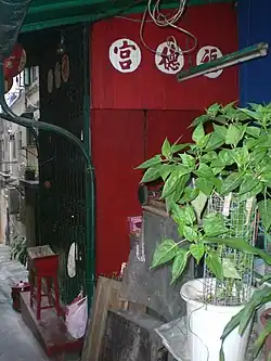A shrine to a Tudigong within the entrance gate of Tai Wai Village, a walled village of Hong Kong.
