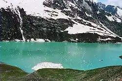 Sheshnag Lake (Urdu pronunciation: [ʃeːʃnɑːɡ] ; Kashmiri pronunciation: [ʃiːʃinaːɡ]) is an alpine high elevation oligotrophic lake[1] located in Amarnath in the Anantnag district of Kashmir Valley in Jammu and Kashmir, India at an elevation of 3590 meters. It is situated on the track leading to the Amarnath cave, about 77 km from Anantnag city & 23 km from Pahalgam. It has a maximum length of 1.1 km and maximum width of 0.7 km.