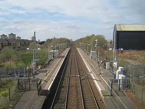 Shieldmuir railway station is a railway station in the Craigneuk suburb of Wishaw, North Lanarkshire, Scotland, and lies on the West Coast Main Line, although it is not served by mainline services – local commuter services from the station are provided via the Argyle Line by ScotRail on behalf of Strathclyde Partnership for Transport. The station is close to Wishaw railway station. The bulk of commuters are from the nearby suburbs of Craigneuk and Muirhouse, which it spans the border between. The bridge used to cross the railway also connects the two towns. Although Shieldmuir can be used to reach Wishaw General Hospital by train, it and Wishaw station are both a considerable distance away for any visitors there.