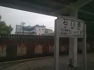 Shimenxian railway station (Chinese: 石门县站) is a fourth-class railway station in Shimen County, Changde, Hunan, China on the Jiaozuo–Liuzhou railway. It was built in 1978.[1] Passenger services have been suspended since 3 July 2013 due to the better location of Shimenxian North railway station.[2]
