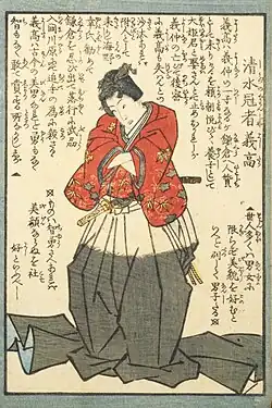Shimizu no kanja Yoshitaka was a samurai warrior from the late Heian period of Japan.[1] The eldest son of Yoshinaka of Kiso, Minamoto clan.[1][2] In his eleventh year, he was sent to Minamoto no Yoritomo as a hostage in order to avoid the conflict between his father and Yoritomo.[1][2][3] According to traditions, Yoshitaka fell in love with Ōhime, the eldest daughter of Yoritomo.[4] Later years, as a result of the discord between Yoshinaka and Yoritomo, the latter defeated the former.[1] Three month later from the killing of his father, Yoshitaka fled, but captured and executed at a riverbed of Iruma River.[5] In later years, many works featuring Yoshitaka were made, including A Tale of Kiso Yoshitaka (or Shimizu no kanja) in Otogi-zōshi, Raigōajarikaisoden by Takizawa Bakin, and some Noh songs.[1] Yoshitaka has been said to be handsome.[6]