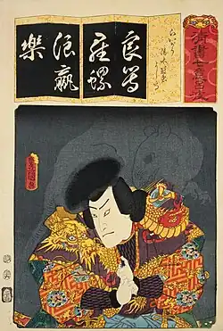 Raigōajarikaisoden was published in 1808.[11] This was so popular that it was performed as kabuki at Osaka soon after the publishing.[11] In Raigōajarikaisoden, Yoshitaka as the protagonist tries to avenge his father on Yoritomo in order to fulfill his filial duty.[11] By the power of course, Yoshitaka is able to use magic words to employ rats to work.[11]. However, he finally fails.[11] It is said that the story of Raigōajarikaisoden comprises double confrontations between Yoritomo and Yoshitaka, and between cat and rat.[11]