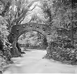 The river is crossed by 16 bridges as it flows through Tollymore Forest Park. The Old Bridge, built by James Hamilton in 1726, is the oldest of the current bridges. The Ivy Bridge was built in 1780 and Foley's Bridge in 1787. Parnell Bridge, named in recognition of Sir John Parnell who visited Tollymore in the late 18th century, was constructed in 1842. It was the last stone bridge to be built in Tollymore. The more recent footbridges are constructed from wood.[12] Castle Bridge is located near the mouth where Main Street crosses the river. It was originally called Fearsat an Chaislein Nui (The Ford or Pass of the Newcastle) and was next to the entrance to the castle. This was replaced by a wider, straighter bridge in the 1890s.[13]