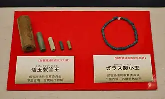 The tumulus was first excavated in 1929 by local villagers, who appear to have destroyed the wooden sarcophagus and to have looted most of the grave goods. Some remaining grave goods were found in an academic excavation in 1974, leading to the National Historic Site designation in 1976. A second excavation was conducted in 2000 and a third excavation in 2005.[2] Artifacts recovered (and preserved) include 56 glass beads, one iron sword and fragments of two more swords, one large jadeite ball and six jadeite tubes and pottery shards of Jomon and Yayoi pottery, some of which appears to have been imported from, or influenced by, the Tōkai region. However, some pottery shards from the Heian period into the Muromachi period have also been found, indicating that this site may have been contaminated in pre-modern times. Photographs of an exhibition of grave goods after the 1929 indicate that a number of bronze mirrors were recovered at that time, but the whereabouts of these artifacts is now unknown.