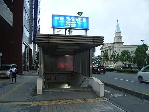 Shiyakushomae Station (市役所前駅, Shiyakushomae-eki) is an underground railway station in the city of Nagano, Japan, operated by the private railway operating company Nagano Electric Railway.