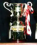 In 1998, the two tournament trophies were donated by the former Prime Minister of Japan, Mr. Ryutaro Hashimoto, as tokens of his encouragement.[3] At the time, Hashimoto-sensei saw this tournament and all of North American collegiate kendo as a "rising dragon", or 昇龍 (shōryu), hence the name shoryuhai. The first of the trophies - permanently held at Harvard - bears the engraved names of each year's victorious team. The second, traveling trophy is loaned to each year's winning team to be displayed at their respective university or college until the following year's tournament.