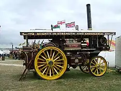 Production of showman's engines tailed off in the late-1920s, with the last Burrell 'Simplicity' being built by Garrett's of Leiston in 1930.[5] The decline was due to the rise of diesel trucks initially helped by the availability of large numbers of former military vehicles at the end of World War 1.[1] A 1927 act of parliament reduced road tax payments if the engine had rubber tyres which resulted in them becoming nearly universal.[1]