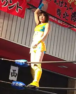 Shibutani received her training in professional wrestling at the dojo of the JDStar promotion, being part of the last batch of women to go through the promotion's "Athtress" program, which aimed at building physically attractive women into not only professional wrestlers, but also mainstream celebrities.[2][7] Originally, Shibutani had unsuccessfully applied for a traineeship at the dojo of the Major Girl's Fighting AtoZ promotion.[8][9] She made her in-ring debut under the ring name Shuu Shibutani on September 19, 2004, facing Akino at Shin-Kiba 1st Ring in Tokyo.[1][2] Shibutani won her first title before the end of the year, when she and Athtress training partner Fuka defeated Gami and Drake Morimatsu for the TWF World Tag Team Championship on December 5.[2][10] They, however, lost the title back to Gami and Morimatsu later that same day.[10] Early on in her career, Shibutani earned praise for her talent and was put in a high-profile role, effectively replacing the injured Yumi Ohka.[2] While working regularly for JDStar, she also made several appearances for the Ibuki promotion.[2] From April to June 2006, Shibutani took part in the first ever League Princess tournament,[11] but was eliminated from her round-robin, following a loss to Fuka in her final match on June 18.[12] She was however recognized as having the best match of the tournament with Ayumi Kurihara.[2] By late 2006, Shibutani had established herself as one of JDStar's top wrestlers, starting a storyline rivalry with the villainous Caribbean Gundan stable of Caribbean Kim, Caribbean Moon and Caribbean Rum.[13][14] The rivalry culminated on March 21, 2007, in a six-woman elimination tag team match, where "Team Shin-Kiba" of Shibutani, Cherry and Yuri Urai defeated Caribbean Gundan with Shibutani scoring the last elimination over Kim.[15] Two months later, JDStar announced that the promotion would be folding after the July 16 event.[16] At the final event, Shibutani first teamed with Misaki Ohata in a tag team match, where they were defeated by Fuka and Jaguar Yokota.[5] Later in the event, she won a multi-person battle royal, the last match ever put together by JDStar.[5]