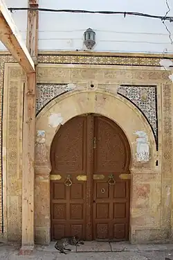 Access to the monument is through a carved wooden door located in a richly decorated stone frame (moldings, geometric and floral motifs, earthenware tiles, epigraphic inscription, etc.). On either side of the entrance door, there are two symmetrical wrought iron windows with stone framing.[1]