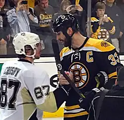 On June 28, 2012, the Penguins announced that Crosby agreed to a 12-year, $104.4 million contract extension set to keep Crosby in Pittsburgh through to the end of the 2024–25 NHL season.[94] The start of the 2012–13 season was postponed until January 2013 due to the owners locking out the players as negotiations took place to solidify a new collective agreement for the players. During this time, Crosby was a regular attendee of meetings taking place between National Hockey League Players' Association (NHLPA) representatives and NHL owners. The lock-out began on September 15, 2012, and ended on January 6, 2013, with the NHL regular season beginning on January 19.[95] During the 119-day lock-out, Crosby was often questioned about his future plans should the lockout persist, and said on more than one occasion that he was considering contract offers from various teams in European leagues (where many NHL players went so that they could continue playing in a professional capacity while waiting for the lock-out to end or for the NHL season to be officially cancelled). Crosby continued to practice and participated with other NHL players who did not go overseas in several exhibition games open to the public.[96] With the season finally underway in January 2013, Crosby set the pace for scoring, totalling 31 points (nine goals and 22 assists) through the first 21 games. He remained hot through March, scoring another 25 points (six goals and 19 assists) in 15 games as the Penguins went unbeaten over this stretch. However, his regular season came to an abrupt end on March 30 in a home game against the New York Islanders. Crosby's teammate Brooks Orpik unleashed a slapshot which caught Crosby in the mouth, causing the centreman to lose several teeth. Crosby was down on the ice for several minutes before the medical staff was able to help him to the dressing room with Crosby holding a towel over his face. Initially, the prognosis was not severe, but it was discovered a short while later that Crosby had broken his jaw and would require several rounds of reconstructive dental surgery.[97] He missed the final 12 games of the regular season and finished fourth in the scoring race, losing the title to Tampa Bay's Martin St. Louis by four points.[98] Crosby returned to the ice May 5 for the Penguins' second game against their first-round playoff opponents, the New York Islanders, ironically, the team who Pittsburgh played when Crosby was injured weeks prior. Despite two goals from Crosby, Pittsburgh lost 3–2, tying the series at one game apiece.[99] The top-seeded Penguins would ultimately prevail 4–2 in the series over the eighth-seeded Islanders with Crosby scoring nine points (three goals and six assists) in the five games in which he played.[100] Crosby and the Penguins moved on to face the Ottawa Senators in the second round, with Crosby scoring a hat-trick in game two of the series. Pittsburgh quickly defeated Ottawa four games to one in the series with a still-hot Crosby finishing the series with four goals and two assists. The Eastern Conference finals came down to what many felt were the two best teams in the conference: Pittsburgh and Boston Bruins goaltender Tuukka Rask put on an outstanding performance, shutting down Pittsburgh's potent offence with the help of a stifling defensive effort from his teammates. The Penguins were held to just two goals in the series, with Rask stopping 134 of 136 shots on goal (.985%). Crosby, who was strong for the Penguins in the regular season and through the first two rounds of the playoffs was held off the score sheet entirely, finishing the series with no goals and no assists on 13 shots within the four games as the Bruins swept the Penguins in four-straight games.[101] In the off-season, Crosby was awarded his second Ted Lindsay Award and finished as runner-up to the Hart Memorial Trophy and Bill Masterton Memorial Trophy.[102]