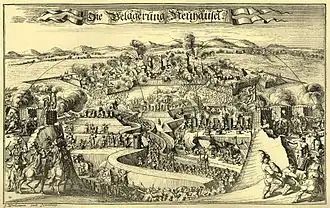The siege of Érsekújvár was fought between July 7 and August 17 of 1685, between the besieging Habsburg army and the Ottoman garrison of Érsekújvár, city in what is today Nové Zámky, Slovakia (Turkish: Uyvar). The Austrian commander, Aeneas de Caprara, invested the city and stormed it on August 17, slaying the entire Ottoman garrison.[1]
