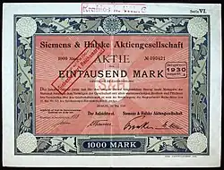 Share of the Siemens & Halske AG, issued May 1920[1]