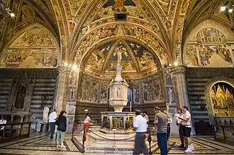 The frescoes are by Vecchietta and his school (1447-1450, Articles of Faith, Prophets and Sibyls), Benvenuto di Giovanni, the school of Jacopo della Quercia e, perhaps, one by Piero Orioli. Vecchietta also painted two scenes on the wall of the apse, representing the Flagellation and the Road to Calvary. Michele di Matteo da Bologna painted in 1477 the frescoes on the vault of the apse.