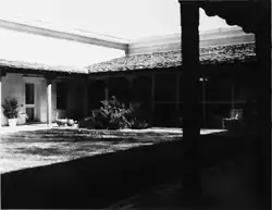 Hooker established his ranch in 1872 on the site of a former Spanish hacienda, one of those destroyed by the Apache many years before. His main ranch house was a large, rectangular, U-shaped structure 80 feet (24 m) by 100 feet (30 m) surrounding a central patio. The walls were built of two rows of adobe bricks 20 inches (510 mm) thick and 16 feet (4.9 m) high. To maximize security, none of the building's outside walls had doors or windows. The only access was through a single gate in a fourth wall, although another door was added in another wall years later when security improved. To maximize self-sufficiency, the patio originally contained a well and a root cellar, but they were later filled in.[10] The roof had gunports in the parapets.[9] Hooker developed a relationship with the Apache Indians who used a trail through the valley near his ranch compound. The trail ran between the United States and Mexico, but Hooker rarely had trouble from them.[10]
