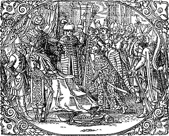 Engraving from Herberstein's book. Ambassadors presenting gifts to the Tsar of Muscovy