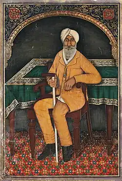 Sikh painting is a form of Sikh art style spread from Punjab Hills to the Punjab Plains which flourished between the 18th to 19th centuries. Major centres for the art school was Lahore, Amritsar, Patiala, Nabha, Kapurthala and Jind. Artists from surrounding regions migrated to Punjab seeking patronage for varying reasons. Most depicted scenes in Sikh painting are of Sikh gurus, portrait of chiefs of the states and court scenes. In the later period the artists painted popular traders of bazaar, such as cobbler carpenter, blacksmith etc. Considering the geographic boundaries were changing frequently in that period and the artists were generally migrants, there is always an overlap between Pahari styles such as Kangra and Guler with the Sikh style.[1][2][3]