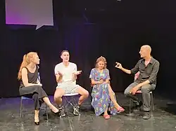 A man (right) using the silent fox gesture at a rehearsal in the Staatsschauspiel Dresden