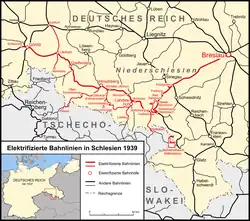 Rail network in and around Lower Silesia, lines electrified by 1939 in red.