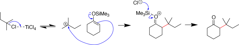 Silyl enol ethers are used in many reactions resulting in alkylation, e.g., Mukaiyama aldol addition, Michael reactions, and Lewis-acid-catalyzed reactions with SN1-reactive electrophiles (e.g., tertiary, allylic, or benzylic alkyl halides).[16][17][18][13][12] Alkylation of silyl enol ethers is especially efficient with tertiary alkyl halides, which form stable carbocations in the presence of Lewis acids like TiCl4 or SnCl4.[12]