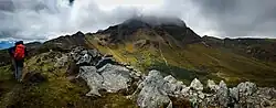 Sincholagua is an inactive volcano located in Ecuador 17 km (11 mi) northeast of Cotopaxi Volcano and 45 km (28 mi) southeast of Quito.[2] It is the 12th highest peak in the country at 4,899 m (16,073 ft) but also one of the lesser known ones. The name of the mountain comes from the indigenous language Quichua and means "strong above".[3] Due to its close proximity to Cotopaxi, the second highest peak in Ecuador and the most popular volcano, it is far less frequently visited compared to other mountains in the country. It has a sharp peak and at one point had glacial cover year round, but all of the glaciers melted a few decades ago. However, snow can still be seen on the peak since there is sometimes heavy snowfall at the summit.[4]