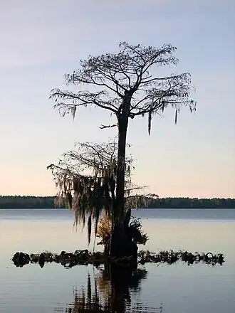 The southwest corner of the lake is bordered by a bog that is densely covered by bay trees. A sandy rim on the southeast side of the lake supports very little vegetation. Venus Flytraps can be found in the margin between the bog and the sand rim.[2]