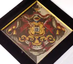 Funerary hatchment of Sir Henry Carew, 7th Baronet in Haccombe Church, showing heraldic achievement of Carew (with canton Red Hand of Ulster) with inescutcheon of pretence of Palk (Sable, an eagle displayed argent beaked and legged or a bordure engrailed of the second)