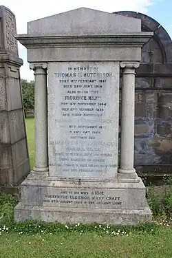 Hutchison is buried with his parents east of the summit in the Glasgow Necropolis.