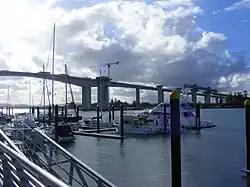 The Sir Leo Hielscher Bridges, formerly and still collectively referred to as the Gateway Bridge, are a pair of twin road bridges that carry the Gateway Motorway (M1) over the Brisbane River, skirting the eastern suburbs of the city of Brisbane. The western bridge carries traffic to the north and the eastern bridge carries traffic to the south. They are the most eastern crossings of the Brisbane River and the closest to Moreton Bay, crossing at the Quarries Reach and linking the suburbs of Eagle Farm and Murarrie. The original western bridge (formerly named the Gateway Bridge) was opened on 11 January 1986 and cost A$92 million to build.[1][3] The duplicate bridge was opened in May 2010, and cost $350 million.[1]