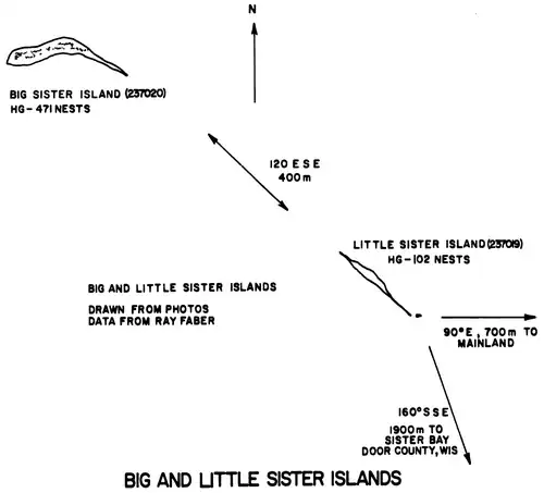 There are many species of birds that nest on the islands. In 1964 there were an estimated 1,350 to 1,650 breeding pairs of herring gulls on the islands.[3] Both islands are owned and operated by the Wisconsin Department of Natural Resources, and they are protected as the Sister Islands State Natural Area.[4]