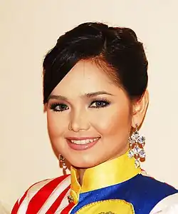 During her childhood, she was involved in various school activities including sports and co-curricular activities.[29] She attended preschool at Tabika Perkep, Balai Polis Kampung Awah, Temerloh where she first showcased her early singing talent at the age of six when she sang "Sirih Pinang",[30] a Malay traditional song, at her kindergarten's certificate-receiving event.[25] She attended primary school at Sekolah Rendah Kebangsaan Clifford and received her secondary education at Sekolah Menengah Kebangsaan Clifford, Kuala Lipis, Pahang.[29] In 1991, when she was 12 years old, she won one of her earliest singing competitions, with the song "Bahtera Merdeka" at the Merdeka Day Singing Contest, a local patriotic song competition.[31][32] During her schooling years, she was active in sports, especially in netball.[33] She participated in two different sports events – netball and 5x80 meter relay – during the Fiesta Media Idola 2006 in Kuantan.[34] She was also chosen as one of the torch bearers to light the games of the Fiesta, marking its opening alongside Malaysian actress, Fasha Sandha.[34]