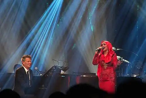 In February,[173] she was announced as one of the guest artists in a one-night only "David Foster and Friends" show that was originally scheduled as the major event of Sapurakencana Petroleum Malaysia Grand Prix Gala Dinner & Concert 2014 on 27 March.[174] However, due to the date's proximity to the Malaysia Airlines Flight 370 incident, the entire show was later revamped to become a full-fledged tribute concert.[175] During the night of the show, she was accompanied by Foster on piano to perform two songs that Foster originally produced – I Will Always Love You and Because You Loved Me.[176] Foster also accompanied Siti to Siti's own single, Seindah Biasa.[176]