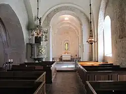 The church was expanded in the 14th century, when a chapel and a vestry were added.[3] In the 15th century the church was decorated internally with frescos depicting the Coronation of the Virgin.[2] At the same time the tower was raised two storeys.[3] During the 18th century, a burial chapel for the Swedish noble family Jennings was added. The church has been devastated by fire on at least two occasions, in 1642 and 1806, but still retains much of its medieval ambience.[3]
