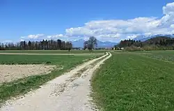 The Skaručna Basin has a characteristic mixed cultural landscape, with meadows, tilled fields, pastures, watercourses, vegetation corridors, hedgerows, isolated hills, and settlements on the edge of the floodplain.[2] Graben Creek starts at Loess Pond (Slovene: Phliški bajer or Puhliški bajer,[3] also known as Koseze Pond, Koseški bajer[4]) in the northeast part of the basin; the pond is a former clay pit created about 200 years ago where ice was also harvested until the First World War.[4] Graben Creek runs along the southeast edge of the basin, fed by Brodnek Spring, Smrekar Spring (Slovene: Smrekarjev studenec), and Štefan Spring (Slovene: Štefanov studenec) The basin includes the settlements of Vojsko, Skaručna, Vesca, Selo pri Vodicah, and Šinkov Turn.[5]