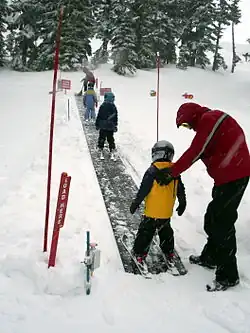 A conveyor lift is a conveyor belt that works similar to an airport moving sidewalk to transport skiers. It is sometimes referred to as magic carpet. At the top, the belt pushes the passengers onto the snow and they slide away. Conveyor lifts are geared towards beginners and families.[19] These lifts are limited to shallow grades because they depend on friction between the belt surface and the skis or board to keep riders in place. Their slow speed, limited distance, and capacity generally confines them to beginner and novice areas.