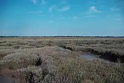 The highest part of the island has thorn thickets, separated by grassy rides. The lowest land is saltmarsh, and there is also extensive rough pasture with brackish pools. Flora include sea hog's fennel and lax-flowered sea-lavender, and there are breeding birds such as shelducks and oystercatchers.[1]