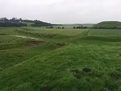 Skipsea Castle outside earth works. The castle was on the raised mound on the right; water would have submerged the low land in the foreground