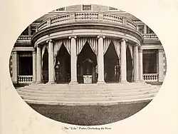 The west facade of the house is the most ornate,[12] and faces the Hudson River, with a view of the river from its terrace and west-facing windows.[6] The curtain wall between the facade's pavilions contains a semicircular portico, and its entablature is upheld by Ionic columns, and supports a balustrade. A flight of semicircular steps descends to the terrace. The river front is parallel with the east front, which had a porte-cochère, a minor entrance, and a service entrance.[12] The main entrance is at the building's south,[13]: 163 directly approached by the south drive. The entrance is recessed, with a portico of Ionic columns over the entranceway.[7]: 60 [24]