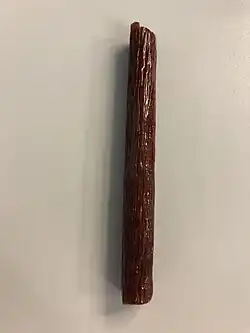 A 2009 Wired article listed some of the ingredients as beef, mechanically separated chicken, lactic acid starter culture, dextrose, salt, sodium nitrite, and hydrolyzed soy.[21] They note that although Conagra refers to Slim Jim as a "meat stick", it resembles a fermented sausage, such as salami or pepperoni, which uses bacteria and sugar to produce lactic acid, lowering the pH of the sausage to around 5.0 and firming up the meat.[21]