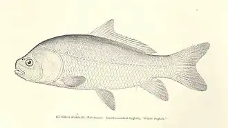 The smallmouth buffalo (Ictiobus bubalus, from the Greek for "bull-fish" and "buffalo") is recently realized as one of the longest-lived fishes, capable of living more than a century.[2] The smallmouth buffalo is in decline across large portions of its range,[3] and is subject to unregulated exploitation.[4][5][6][2][7] They are a catostomid fish species native to the major tributaries and surrounding waters of the Mississippi River in the United States, as well as some other water systems where it has been introduced. It is a long-lived,[8][9][10][2] stocky fish like its relatives the bigmouth buffalo[11] (I. cyprinellus) and the black buffalo[11][2] (I. niger). The smallmouth buffalo's mouth is located ventrally like other Catostomidae species, whereas the bigmouth buffalo's mouth is terminal and opens forward. It is thought that smallmouth buffalo eyes are significantly larger than those of the black buffalo. Despite being members of different scientific suborders, these three species are sometimes conflated with common carp (Cyprinus carpio), but an easy and notable difference is that all catostomids lack the characteristic barbels of carp, and carp are not native to North America whereas buffalofish are. Like the other buffalofish species, the smallmouth buffalo is targeted by modern bowfishing. [11][6][4][10][3][2][5][7]