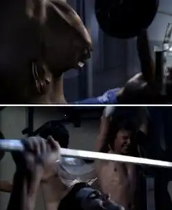For the end of "Exile", Joey Bratazani and Brian Harding worked on the computer effects shots of the Kryptonian tattoo, which was burned into Clark's chest at the end of season two, disappearing at the end of Clark's fight with Jonathan. John Wash describes the effect as being similar to a time-lapse, where someone would watch a flower grow, but in the reverse. Bratazani and Harding had to track the effect to Welling's chest, in order for it to look like his skin was really being burned from underneath; otherwise, the shot would have appeared to be just a 2-dimensional light being broadcast on his chest.[32] Just like the Kryptonian tattoo was something created digitally in season two, so was the digital body duplication of Ian Randall, which the special effects team had the chance to work on for a second time in season three's "Asylum". For "Asylum", special effects coordinator Mat Beck and his team used 3-dimensional strands for Ian's separation, which gave the team more control, as well as make the strands appear "gooier and grosser".[33] The original effect in season two consisted of Entity FX using a primary shot of a CGI face pushing its way through a CGI back in three dimensions. This time, the team used a two dimensional shot appearing on a wall—known as "shadow play"—as though the audience is seeing Ian's shadow as he splits himself; lastly, the team applied another two dimensional effect to the final moment of separation, when strands of CGI flesh snap back to each body.[51]