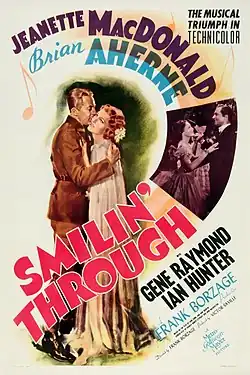 Smilin' Through is a 1941 American Technicolor musical film directed by Frank Borzage and starring Jeanette MacDonald, Brian Aherne, Gene Raymond and Ian Hunter.[2][3] Produced by Metro-Goldwyn-Mayer, it is based on the 1919 play of the same name by Jane Cowl and Jane Murfin. The film was a remake of a previous 1932 version by MGM and was the third and final film version of the play. It was filmed in Technicolor and was remade as a musical for MacDonald with several older songs interpolated into the story.