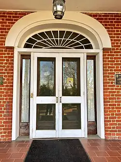 The original Federal character that dominated the house's exterior remains in the large fanlight above the front doors and in the delicacy of the front porch that is supported by twelve slender fluted columns (six on each level).[3] The house has corbelled cornices that feature dentils.[3] The exterior of the building at one time displayed penciling, and remnants remain in several spots.[3]