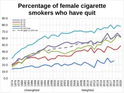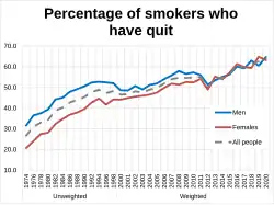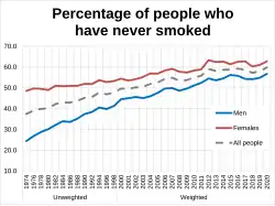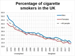 In 1962, over 70% of British men and 40% of British women smoked.[17] As recently as 1974, 45% of the British population smoked. This was down to 30% by the early 1990s, 21% by 2010, and 19.3% by 2013, the lowest level recorded for eighty years.[18] An annual No Smoking Day has occurred in March since 1984.[19]