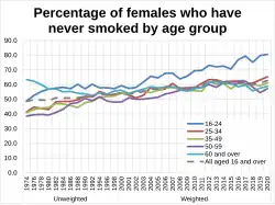 In 2015, it was reported smoking rates in England had fallen to 16.9%, a record low.[20] In 2018, the UK smoking rate had fallen to 14.4%.[21] 25–34 year olds had the highest smoking rate, with approximately 1 in 5 people within this age range (around 1.4 million adults) being smokers.