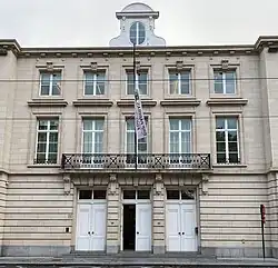 In 1966, the SGB and Société Générale de Banque decided to demolish and rebuild the entire block,[10] including the Petit Béguinage on the corner of the Rue Royale and the Rue Montagne du Parc, also designed by Barnabé Guimard in the late 18th century, which was razed in 1968.[8] The new structures fronting the Rue Royale, designed by Pierre Guillissen and Hugo Van Kuyck in neoclassical style reminiscent of Guimard, were completed in 1972, while the Générale de Banque's new head office downhill was reconstructed in several phases in brutalist style.[9] The new SGB building displayed a long, symmetrical façade with a main entrance at 20, rue Royale. Following the respective mergers of the SGB into Suez-Lyonnaise and of the Générale de Banque into Fortis Group in 1999, the building was taken over by Fortis and used as its Belgian headquarters, then after 2008 by BNP Paribas Fortis.